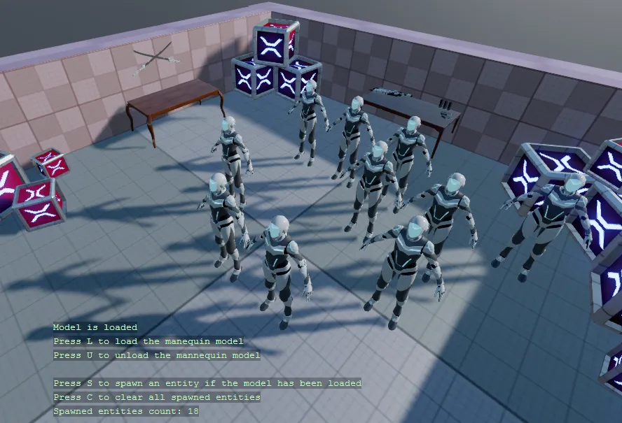 The C clears all of the spawned entities in the scene. This demo demonstrates that when models are unloaded, any entities that reference the model are still existing in the scene.