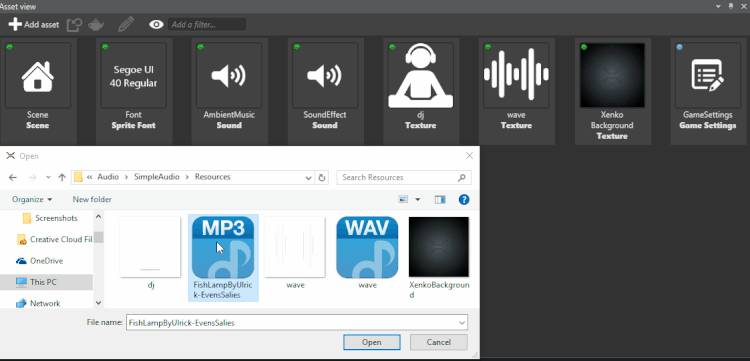 プロジェクトでサウンド アセットとして使用するオーディオ ファイルをインポートできます。インポートできるファイルの種類は、.wav、.mp3、.ogg、.aac、.aiff、.flac、.m4a、.wma、.mpc です。